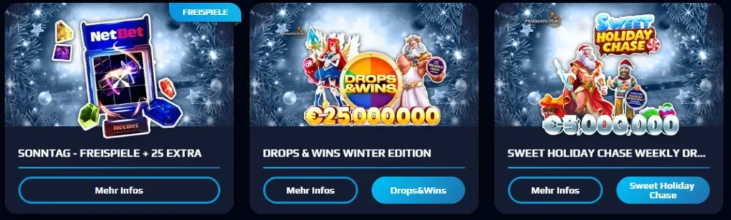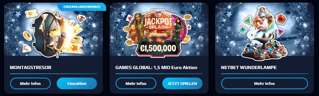 Im netbet Casino gibt es eine Vielzahl von Aktionen: Willkommensboni, Reload-Angebote, Freispiele und regelmäßige Promotionen. Mit einem netbet Promo-Code ohne Einzahlung lassen sich oft Freispiele oder ein kostenloser Spin sichern. Der klassische netbet Bonus bietet zusätzliches Bonusguthaben für Einzahlungen, während exklusive Aktionen gelegentlich Spins ohne Einzahlung oder Aktionscodes mit Freispielen freischalten. Registrieren, verifizieren und das passende Angebot abholen.
